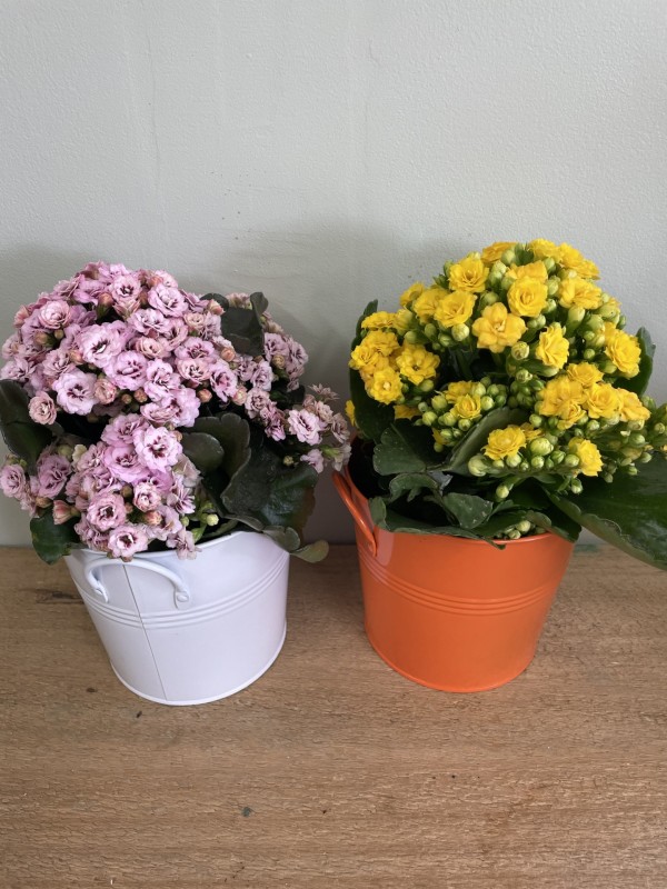 Flowering, lasting, easy care succulent plant presented in a toning colourful water proof enamelled tin. This lettle gem will not even mind if you forget to water it